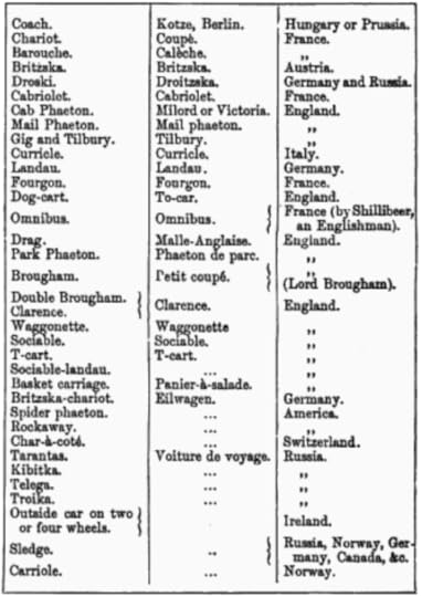 This passage comes from the entry for “Carriage,” sub-section “Modern Carriages,” in the 1876 edition of the Encyclopedia Britannica, and — as if to prove the point — it’s followed by this chart of carriages and their countries of origin: