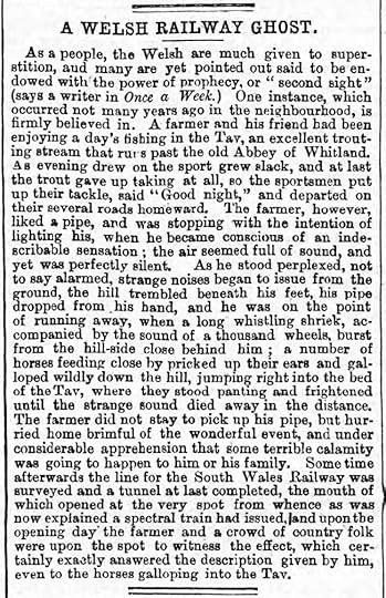 A Phantom Train That Arrived EarlyAn article titled “Beyond Gower’s Land” appeared in the November 12, 1864, issue of the magazine Once a Week. It’s I.D. Fenton’s chronicle of a journey through Wales, and along the way, the traveler transcribes an anecdote heard in the South West region. Within context, this anecdote has the feel of folklore, a charming and quirky tale the locals tell. Whether or not the locals honestly believe it is another matter.