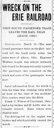 As Wrecks Go…On March 22, 1899, a westbound train derailed near Rittman, Ohio. One source reports that the train had been running at 60 miles an hour, and a later one explains that speeding along this stretch of the Erie Railroad allowed engineers to stay on schedule. Unfortunately, on that run in March, the No. 5 broke a driving rod, which probably lead to the wreck. (Another source uses the term “parallel rod,” but clearly it was some sort of engine trouble.) With even greater speed, news of the tragedy reached Washington, D.C., later that same day and California the very next.