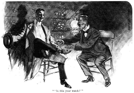 John Cameron’s illustration of Cecil Thorold being asked about his stolen watch appeared in Windsor Magazine.A Promising to Saddening ChoiceNow, if the name William Le Queux rings a bell, it’s probably because of his role in establishing spy fiction. His 1906 novel The Invasion of 1910 depicts a war between England and Germany, and it was published eight years before WWI. The Count’s Chauffeur (1907) can be seen as Le Queux’s contribution to that wave of crime fiction from which I’m curating my “9-volume anthology” called the Curated Crime Collection.