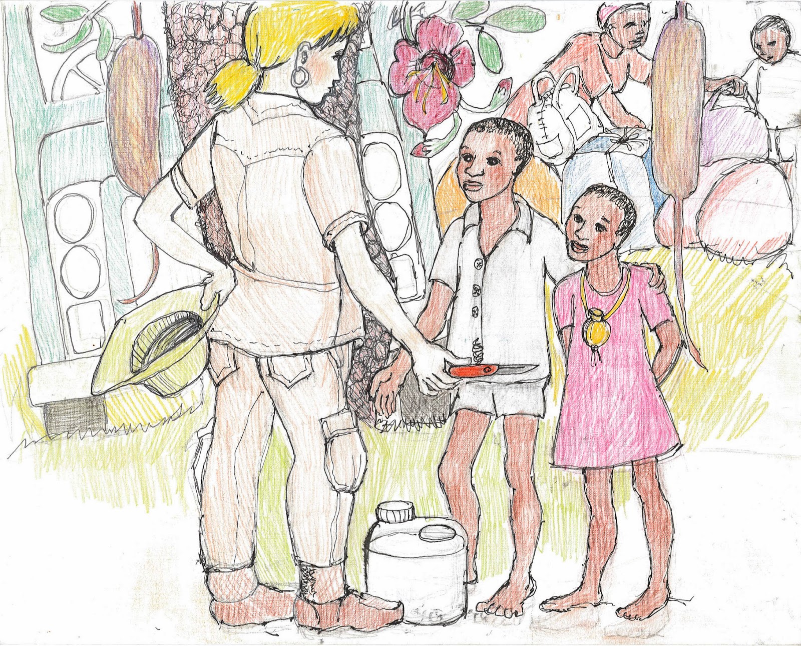 Adam decided to help his brave sister though he knew there would not be one drop of water left to destroy the Drought Witch if he gave her a drink. Gently he lifted Constance in his arms and laid her in a small patch of shade under a bare Mulunguti tree. With great care he dripped the last drops of water into Constance’s mouth.