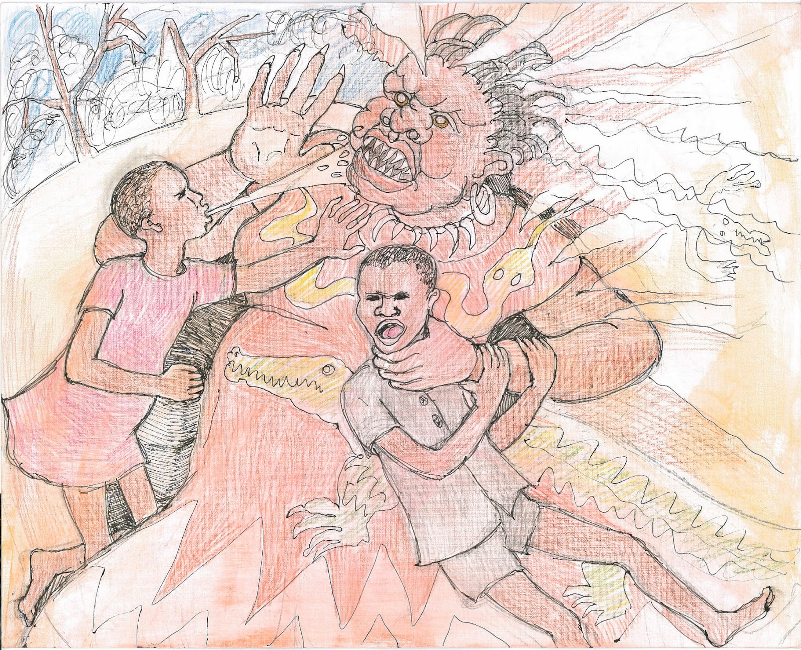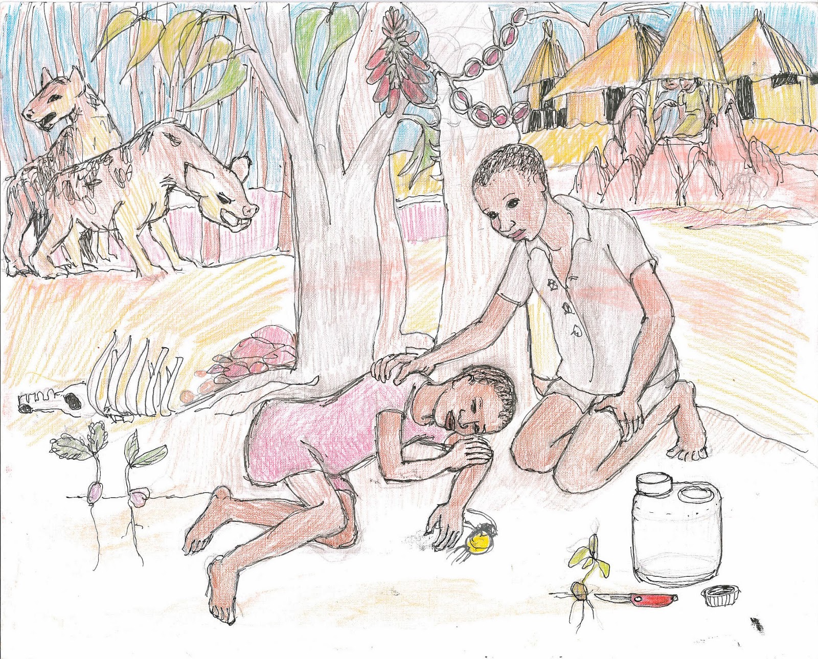 When Adam and Constance managed to open their eyes again they saw that their parents were entertaining a lovely young woman. The children were surprised because they were not expecting visitors that day but they went politely to greet the new guest.‘My name is Kambili.’ the young woman said. Her round eyes blinked fast as she turned her head to stare at the children. They noticed that she was wearing a single red Chitenge around her body and it was damp as if it had just been washed.‘‘Kambili’ means ‘whirlwind’!’ whispered Constance to Adam in fear.‘She must be the witch we saw in the dust storm pretending to be a young woman!’ replied Adam.Adam and Constance tried to warn Simon that Kambili was a witch in disguise but Kambili had cast a spell on their father and he would not listen to them or to Dorcas. Each day that Simon remained under Kambili's spell the sun grew hotter and the rain refused to fall; the crops withered and the cattle grew thin. Soon the grain store was nearly empty. Simon did nothing but sit under the Tamarind tree and drink the Kachasu beer that Kambili made for him from sticks and dead rats.When Kambili realised that Adam and Constance knew her wicked secret, she decided she turn them into mice so she could catch them in a trap. She planned to cook the children and make Simon and Dorcas eat them for supper. 3