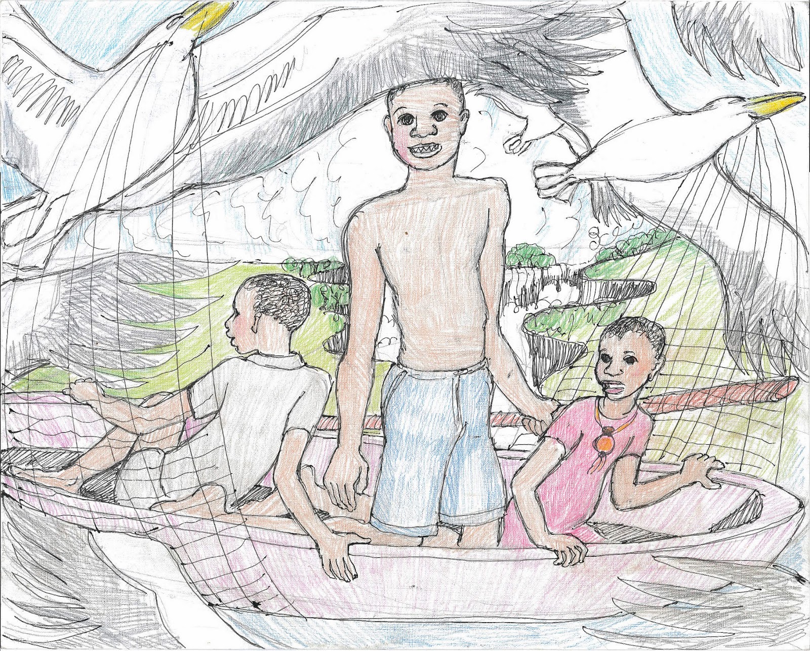 Mokoro the Fisherman did have sharp teeth but he also had a kind smile. He was as long and thin and quiet as the pole he used to steer his dugout canoe. Mokoro made the children comfortable in the canoe and they set off down the Great River.