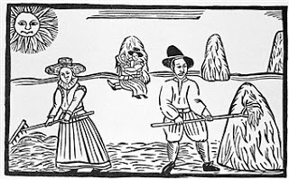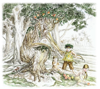 The apple symbolises fruitfulness so barren women would roll on the ground in orchards in an effort to conceive, they also believed that wearing pieces of bark pinned to their clothes would bring them a child, and if it was good year for apples then they could expect to have twins.