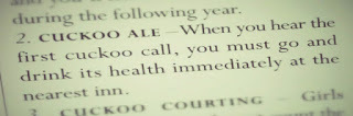 It is at this time of year that you can expect to hear the first cuckoo and if you are walking at the time it is considered to be lucky.Not so lucky to hear it while lying in bed as this means that you or someone in your family will die that year.If you have no money in your pocket when she calls or if you fail toturn over all the coins you have, you will be poor all year.On hearing the cuckoo sit down and immediately take off your left shoe you will find in it a hair of exactly the same colour as that of your true love.