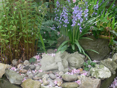 After a night of spring revelry my faerie fell asleep among the bluebells and ferns at the bottom of the garden. Luckily a light covering of cherry blossom has fallen on over her protecting her against the sudden snow shower!