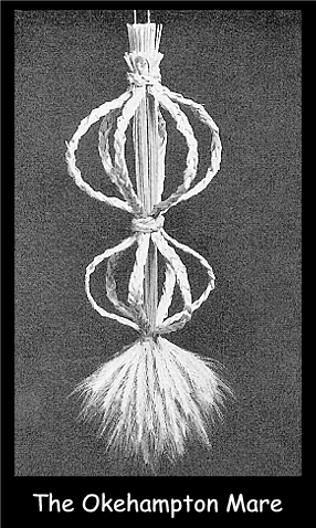The last sheaf of standing corn was always treated with great reverence, and was known by many names; the maiden or the Cailleach ( old woman) in Scotland, the neck or ganders neck in western England; the mare in Herefordshire and the Caesg Fedi (harvest mare) and gwrach (hag) in Wales.