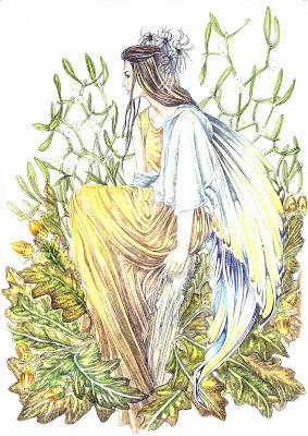 This is an excerpt from 'Faerie Flora'The mistletoe that grows on the oak was sacred to the ancient Celts. it would be cut on the sixth night of the new moon at midsummer and the winter solstice by white robed priests. Using a golden sickle or knife the plant would fall into a cloth held by members of the order, taking care that the sacred plant did not touch the ground. Traditionally two white bulls would be sacrificed at the same time.Sprigs of mistletoe would be distributed for the protection of homes against thunder and lightening.The plant was considered to be one of the most magical as the Celts believed that it bestowed life and fertility and the white berries contained the sperm of the gods.