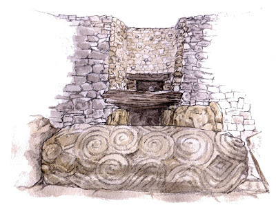 New Grange Passage Tomb , Brugh Na Boinne, Meath.This is one of the finest passage graves in Ireland and it is situated in the ancient Boyne Valley Cemetery.There are three great mounds, three chambers within, a 62 ft passage leads to one chamber. The walls are huge slabs, all carved with intricate spiral and geometric patterns.