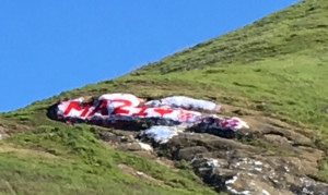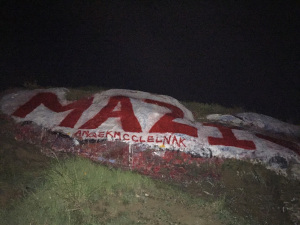 I started planning another bit of midnight mischief to take up a little sign to post by the rock. Something explaining who Mazi is and asking these future delinquents to paint the smaller rock to the left, the one we left alone (you can only carry so much paint up those hills). I keep driving past the rock to make sure the bright white ‘Mazi’ on its red background is still there.