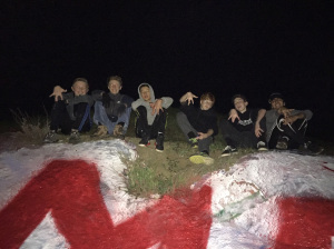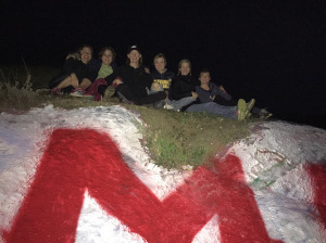 The only way to get the top of the letters painted correctly is for someone to hang out over the top of the rock, and the only way to do that with any degree of safety is for one or more people to hold onto the cliff hanger. Here is last year’s cliff hanger passing the tradition along to her son (with a mask for good measure, isn’t it just like a mom to take her son spray painting and yet insist he wear a mask?????).