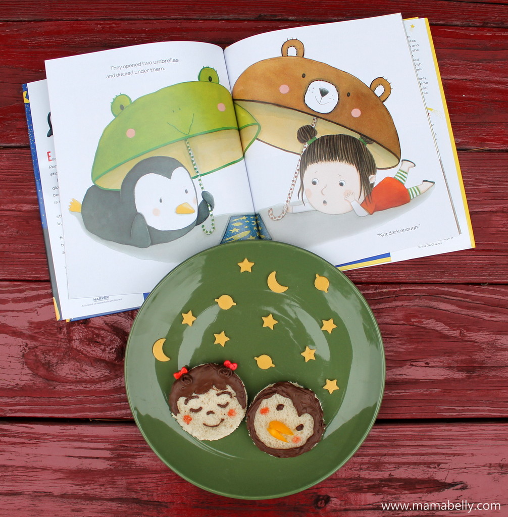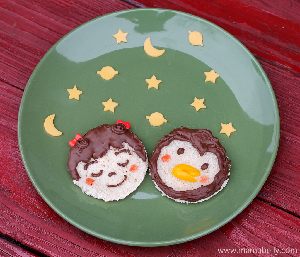 Nina from Mamabelly.com made this lunch using:an Ella sandwich with chocolate and jelly decorations,a penguin sandwich with chocolate and jelly decorations and a yellow pepper beak,and the most important: cheese glow-in-the-dark stickers.