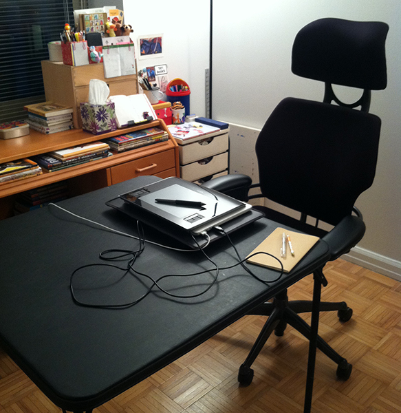 SR: You do. On that second card table next to my desk, I keep paper for drawing, and a stack of art to file. I'm not great about filing art and sketches after I finish them, but I do try to keep it all in one place. This pile is actually quite small, which makes me wonder what happened to the other art that used to be out on the table. I think I filed it. I hope so, otherwise there will be a missing art mystery!