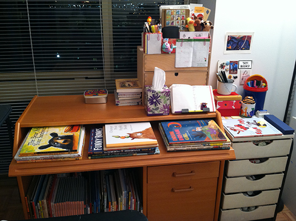 SR: This is my old desk. It has a keyboard tray, which I slid out for your visit. The keyboard tray is a really handy place to put picture books to look at for inspiration. The books keep changing, depending on what I'm working on and what inspires me that week. To the right of the desk is a tabouret which has drawers where I keep art supplies.