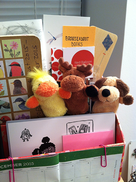 SR: On top of my old desk are some drawers for filing things and an organizer for holding pens, papers, postcards, bookmarks, etc. It's a great place for my finger puppets to hang out.