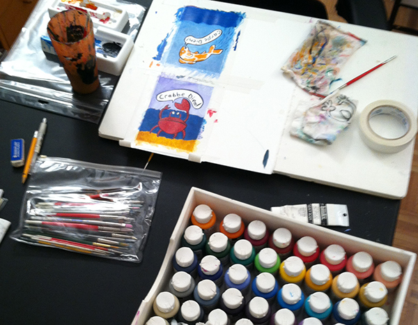 SR: Actually, yes! On top of the tabouret, there's a cup with animals on it that I got when I was little. I keep other items there, too -- pens and markers that I use regularly, some fun magnets, a picture of a painting by one of my favorite painters ('Blue Horses' by Franz Marc), and a copy of my book in case I need it for reference when asked questions about the art or story. I wouldn't have thought I'd need it so much for reference, but it's amazing how much fades when the art is done a year before the book comes out.