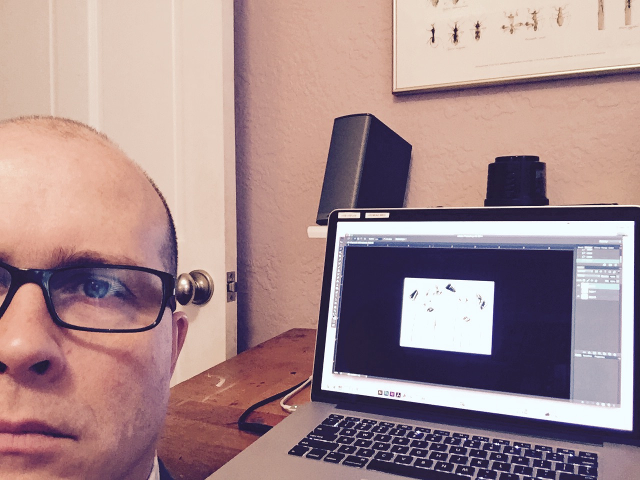EL: No. This is where I do all of my “talented and world-famous Ethan Long” book writing and illustrating. The desk I use was the same desk I had when I was little. It can be a wee bit small when I feel like spreading out, but overall it is very compact. I use a Mac laptop and have all of the necessary features to be a productive and efficient author/illustrator and business man. Adobe Suite, Dropbox, Microsoft Word products, Crashplan. Sometimes I hook up a scanner. What more do I need? (Don’t answer that.)