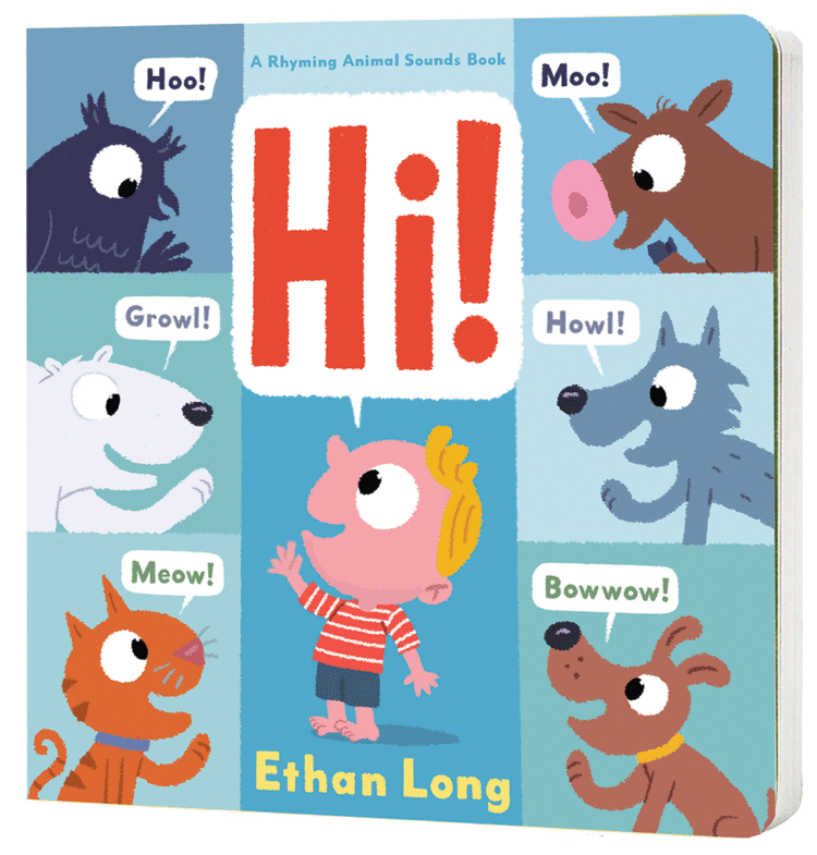 HI!by Ethan LongAbrams Appleseed (May 2015)ISBN 978-1419713651 * "A clever, deceptively simple board book introduces animal sounds. Long's board-book debut proves again that he understands children and what appeals to them. With just one animal per page, each with a one-word salutation, this is a board book that will speak to very young children. . . . A completely satisfying, age-appropriate package." —Kirkus (starred review)