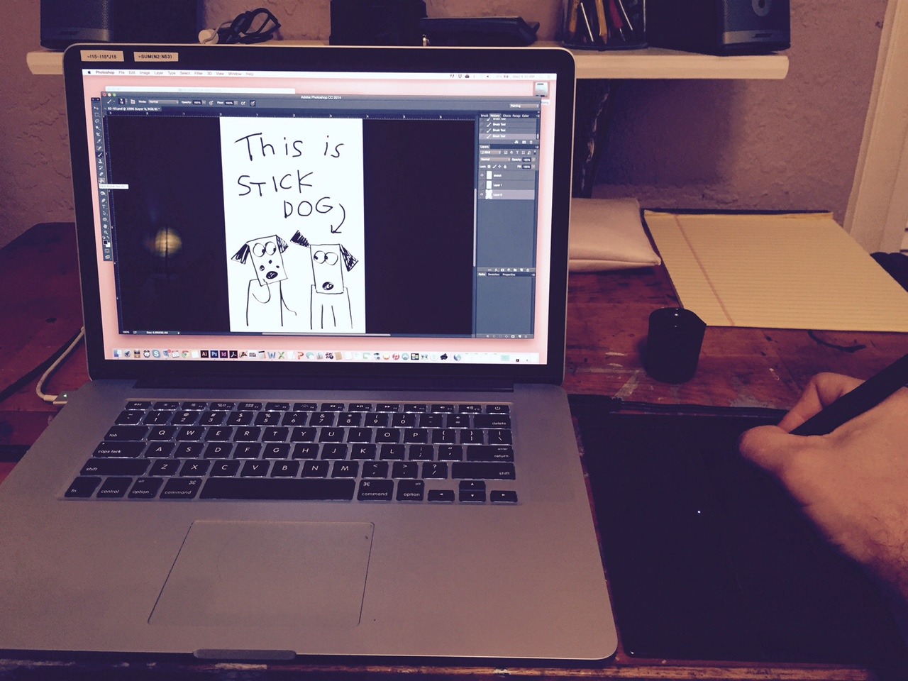 EL: This is an illustration from the wildly popular Stick Dog books, written by Tom Watson. I labeled Stick Dog with an arrow so you will know who Stick Dog is. Tom sends me sketches and I draw over them as only I can. My style is simple, fun, and quirky, which is a perfect fit for this book series. I also do a lot of other kinds of art. Go to my website to see all of that. (http://www.ethanlong.com)