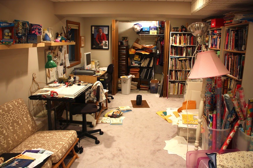 Aaaaand… my computer desk. Work-wise, I use the computer for writing, emailing publishing folks, scanning/sending sketch dummies. Not much else. I don’t use any of that wacom/cintiq stuff. (I’m not even sure if I’ve spelled those right.) I wonder if I ever will. Probably not. My computer is tragically old. I feel like it’s just hanging by a thread. One time I turned it on and it sort of wheezed and then all this dust poofed out of the top of it. (I’m serious. It only did that once, and I don’t know why, but I was terrified it was about to die. It didn’t die.) I keep toying with the idea of buying a new Mac, but I just can’t seem to pull the trigger. I’m waiting on some kind of big windfall or something. Where’s my windfall at?