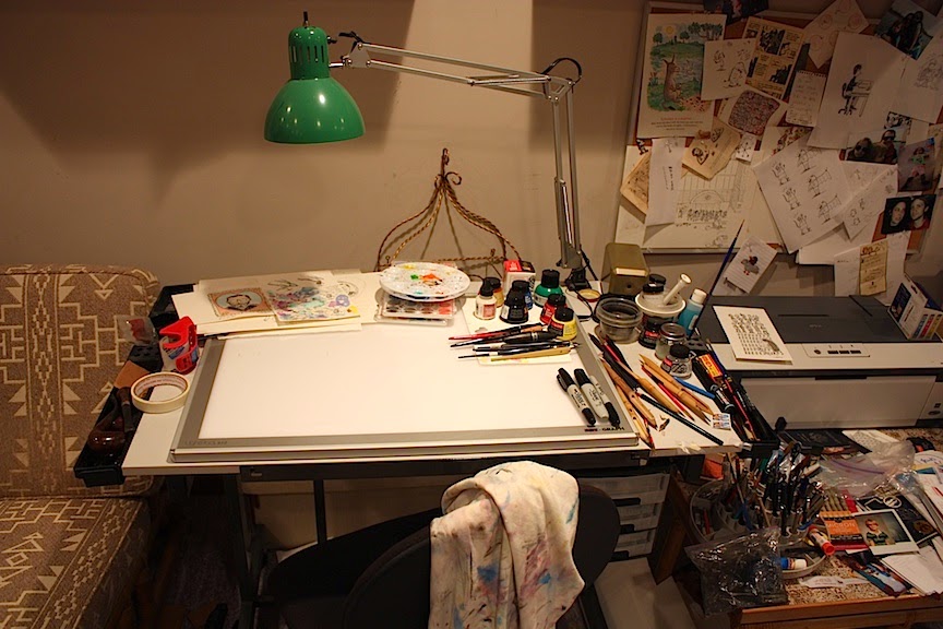 This here is where I do my drawing and painting. Most all of my art is drawn with pen and ink (nib pens and bamboo pens) and colored with watercolor paints. The surface of the desk has a great, big light box or LightPad that I use for going from final, approved sketch, to final, final pen/ink drawings. It’s kind of like tracing but without being too careful about it. Straight-up tracing can make a finished line look pretty boring. I’m all about trying to make a fresh, free, spontaneous line. As if I’d just sat down and drawn it for the very first time. It’s a very tricky balancing act, making a final art drawing from a final sketch. It’s like re-drawing it without actually re-drawing it. If that even makes any kind of sense.