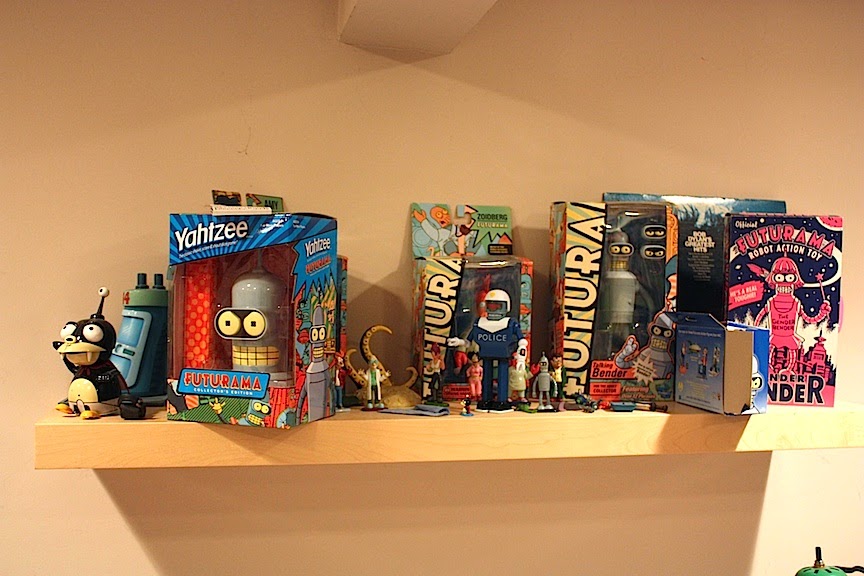 My wife (YA author, Julie Halpern) and I are big time toy lovers. We used to consider ourselves “collectors” but when we had kids (also big time toy lovers), anything we collected, the kids have ransacked, opened up, and played with by now. But there’s lots of shelves down here with toys that Julie and I have collected over the years. “For display only.” Ha ha…