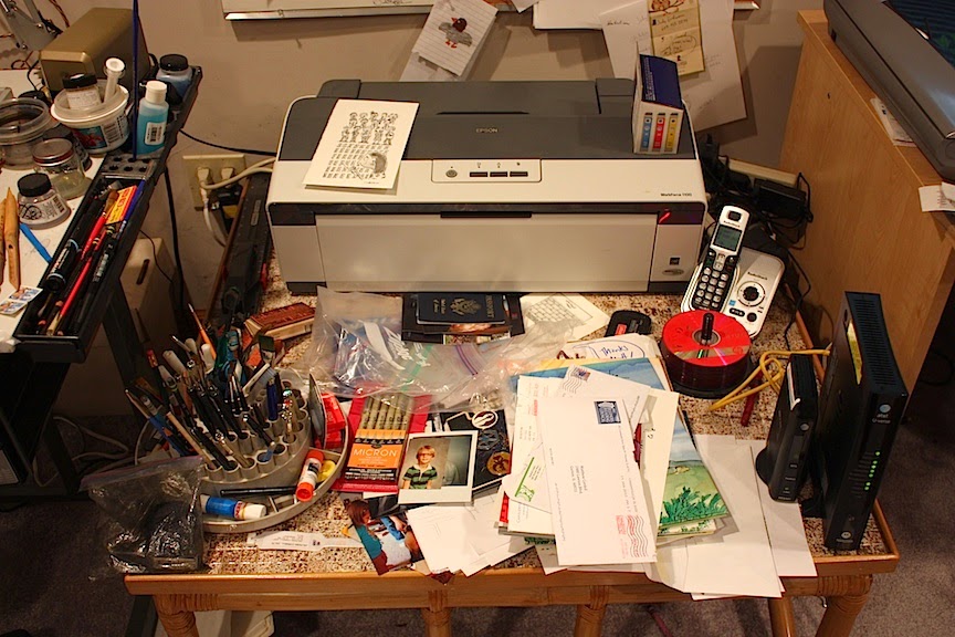 This low table houses a bunch or random papers and clutter. I keep this little lazy susan-y thing there that holds my pens, pencils, nibs, etc. Wireless router on the other side of the table. The main thing this table’s for is my big ol’ printer that sits on it towards the wall. This is a large format ink jet printer that can print on 140 lb. watercolor paper. The inks it runs are waterproof. So… for every line drawing of every piece of final art I create, I scan that in and save to my computer. If I go to paint the original drawing and happen to mess up the color or some other mistake occurs in the painting end of the piece, I can then print a new drawing on this printer and color that printed drawing instead. It’s like a big safety net. I also occasionally make entire books with the intention of printing all the drawings. I can draw bits and pieces of drawings and Frankenstein them together on the computer and print out the fully composed pieces. Ready for color!