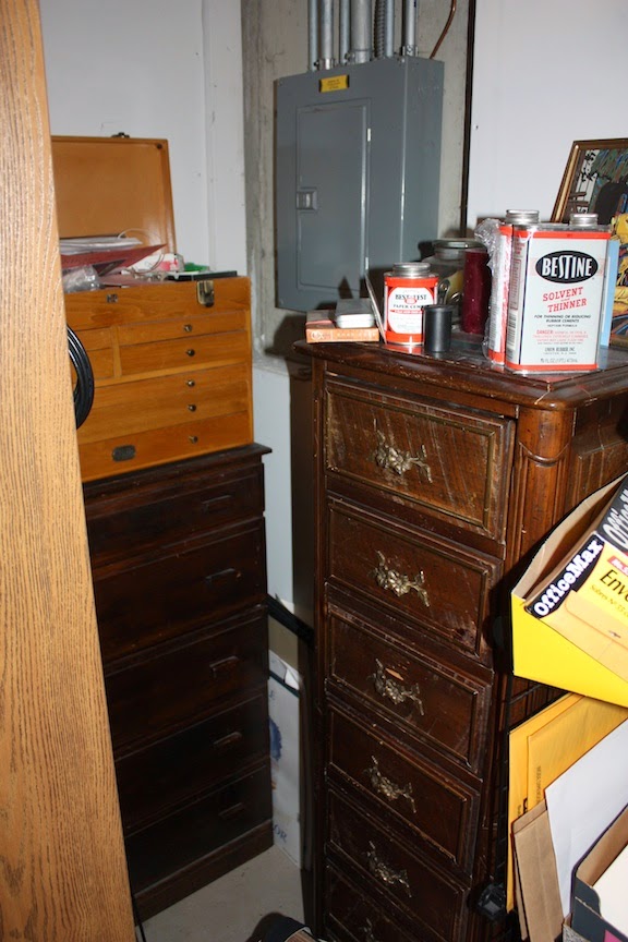 I keep those accordion doors opened up at all times. In this space, I keep drawers of art and shipping supplies, used and unused sketchbooks, old photos and postcards and other things.