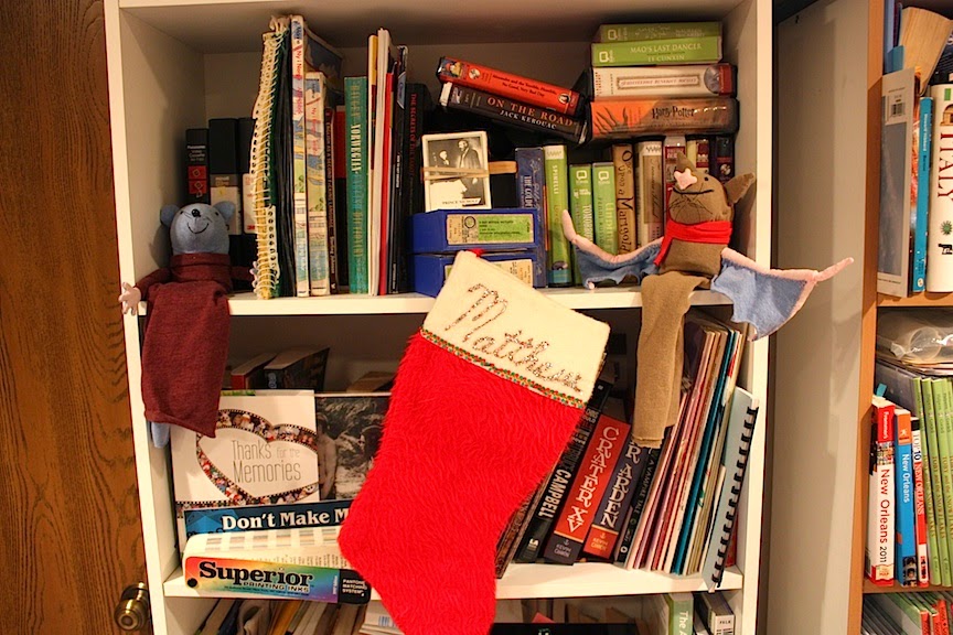 A couple of hand puppets I made from old t-shirts. These guys are the title characters from a picture book I illustrated, BAT AND RAT, written by Patrick Jennings (Abrams 2012). Also the Christmas stocking that I had all through my childhood is hanging here for no particular reason.
