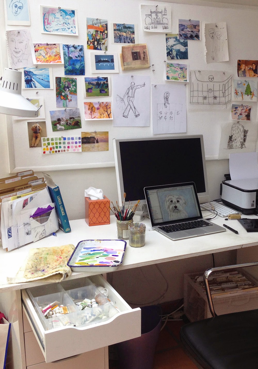 I have two long desktops on Ikea alex drawers that hold sketchbooks, reference photos, artwork in various stages of progress, finished paintings, paints, trays, pencils and pens. There are two large corkboards for inspiration and layouts in progress. There's a comfy chair for sketching, reading, and doing online research.