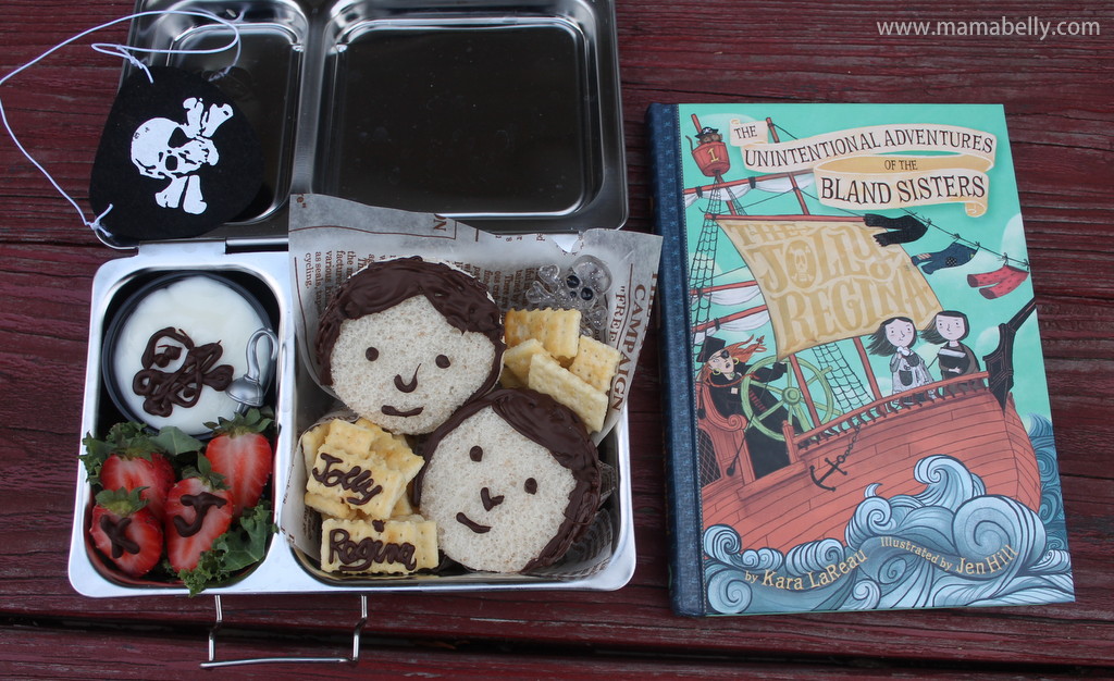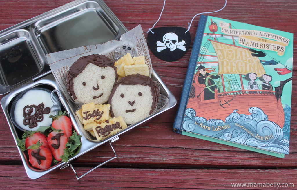 Nina from Mamabelly.com made a bland pirate lunch to match:bland white pirate yogurt with a pirate skullkale and strawberries with Jaundice and Kale's initialsbland crackers with the Jolly Regina planksand two Kale and Jaundice sandwichesWant more fun literary lunch ideas? Follow Mamabelly here: