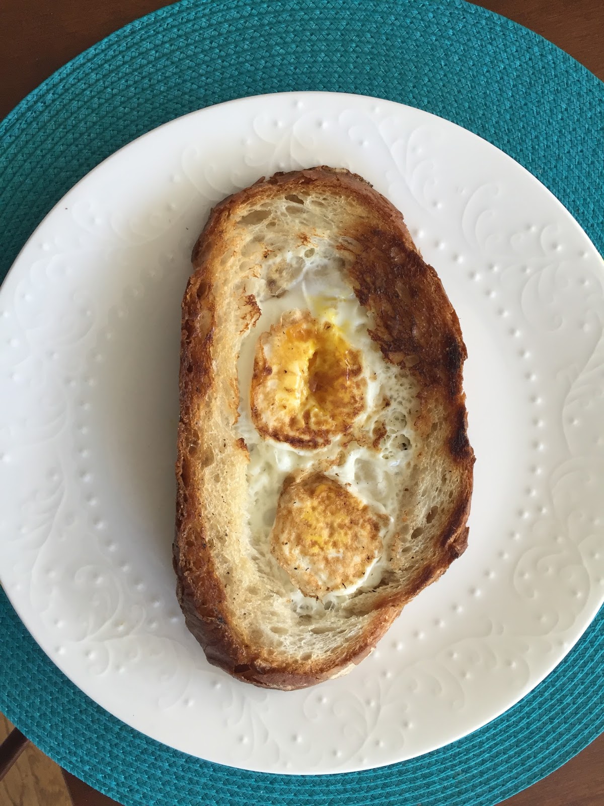 Cut a medium slice of your favorite round bread. I like a good sour dough. Take out most of the center of the bread. Place in a hot pan with butter and crack two eggs in the center. Flip once and cook eggs to your preference. I love the eggs over easy which compliments the crispy bread. Tip: In the last 30 seconds, add a slice of cooked bacon on top. Bacon makes everything special.