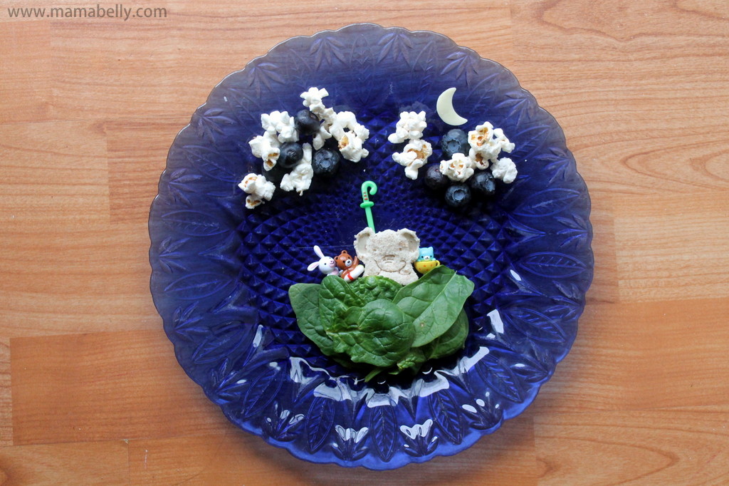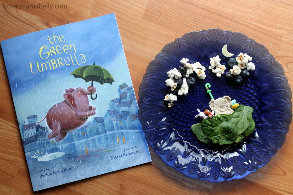 Nina from Mamabelly.commade a lunch for any umbrella adventure:The Green Umbrella cold cut sandwich covered in spinachElephant sandwich cheese sandwich surrounded by cat in a tea cup, bear and old rabbitnight clouds of popcorn and blueberries and a cheese moon to light the way into their next adventur