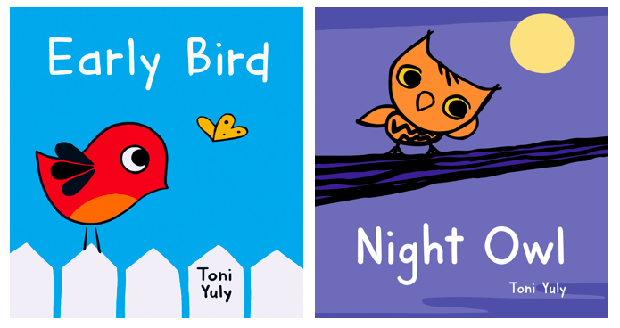 Both books are beautifully illustrated with bright colors and clean shapes. While Early Bird emphasizes action words, Night Owl highlights sound words.