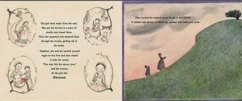 The girl washed the berries inwater from the well. Then she smashed them through a tin sievewith the back of a spoon, getting rid of the seeds.Together, she and her motherpoured sugar on the fruit and then mixed it with the cream."You may lick the spoon, child,"the woman said.So the girl did.Mmmmm.