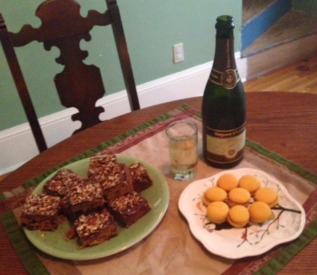 Today's Menu Vegetarian Chili Verde with a dollop of sour creama loaf of crusty French breadsalted caramel sorbetpumpkin blondies topped with dark chocolate and nutspumpkin macaroonsand of course, a bottle of Prosecco