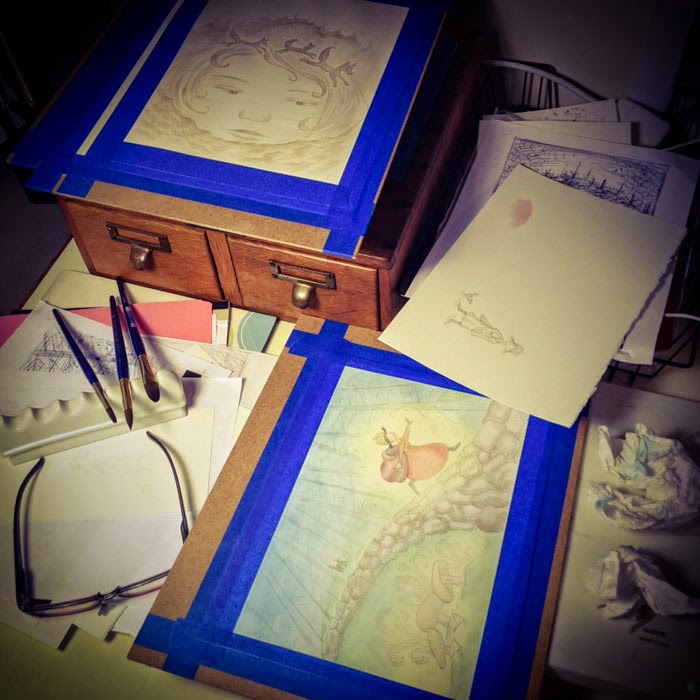 I'm in waiting-mode on my next book project, so here's a photo I took of work-in-progress shot of promo postcard art.-