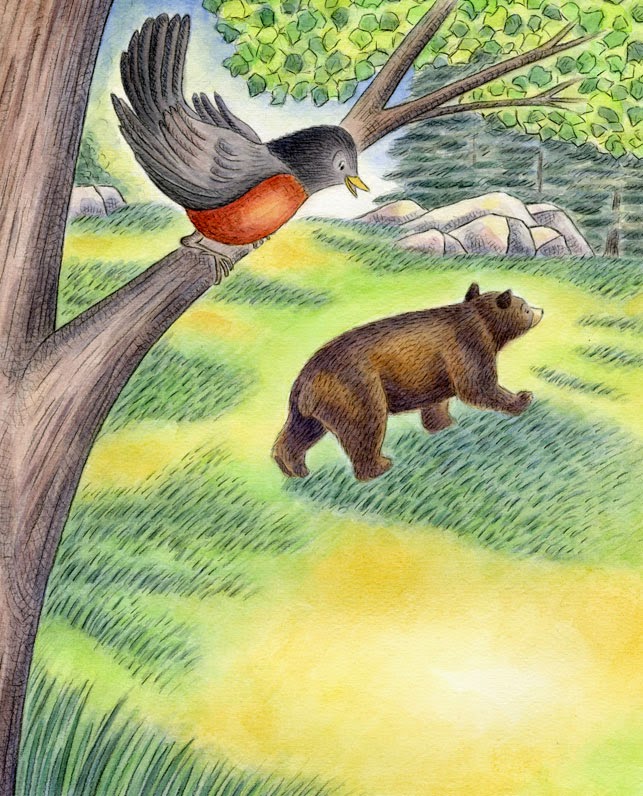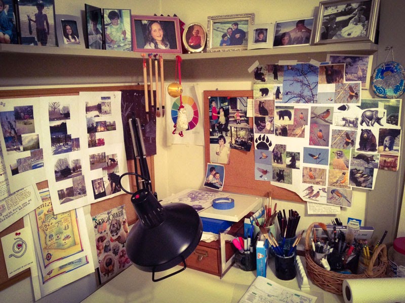 Except for family photos, the wall in front of my table is constantly changing, depending on what I'm working on at the moment. Lots of bear and bird reference pictures here, from when I was illustrating BEAR AND BIRD.