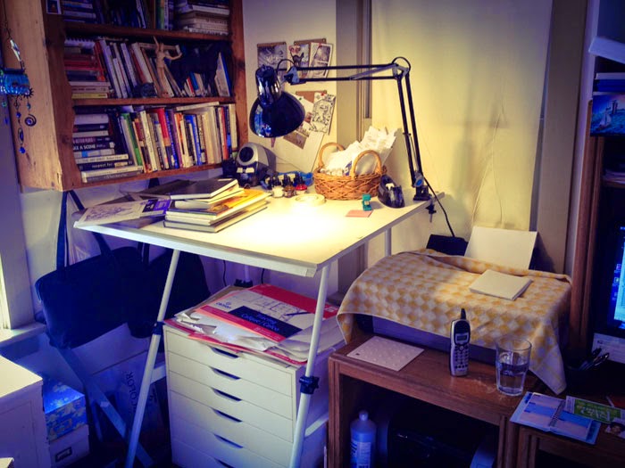 - I've also managed to squeeze a standing desk in here, because... spine! Seriously, it's important not to sit all day. I've paid the price over the years in back pain, though it's in a manageable place now. Best to always make time for exercise, too, no matter how many deadlines are pressing. Good for the body, mind, and art!