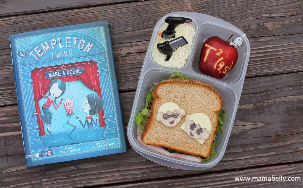 The Narrator's Guacamole which is mostly coleslaw (recipe in the book) decorated with a few tools one needs to build clever inventions.An apple to stay healthy and smart with a Cryptic Crossword* and Cassie, the Ridiculous Dog.A very filling ham-and-salad sandwich topped with the Templeton Twins made from bread, cheese, and German edible paper -- I know, I know, you expected beef tacos.** But ham sandwiches are much easier to eat on the go!
