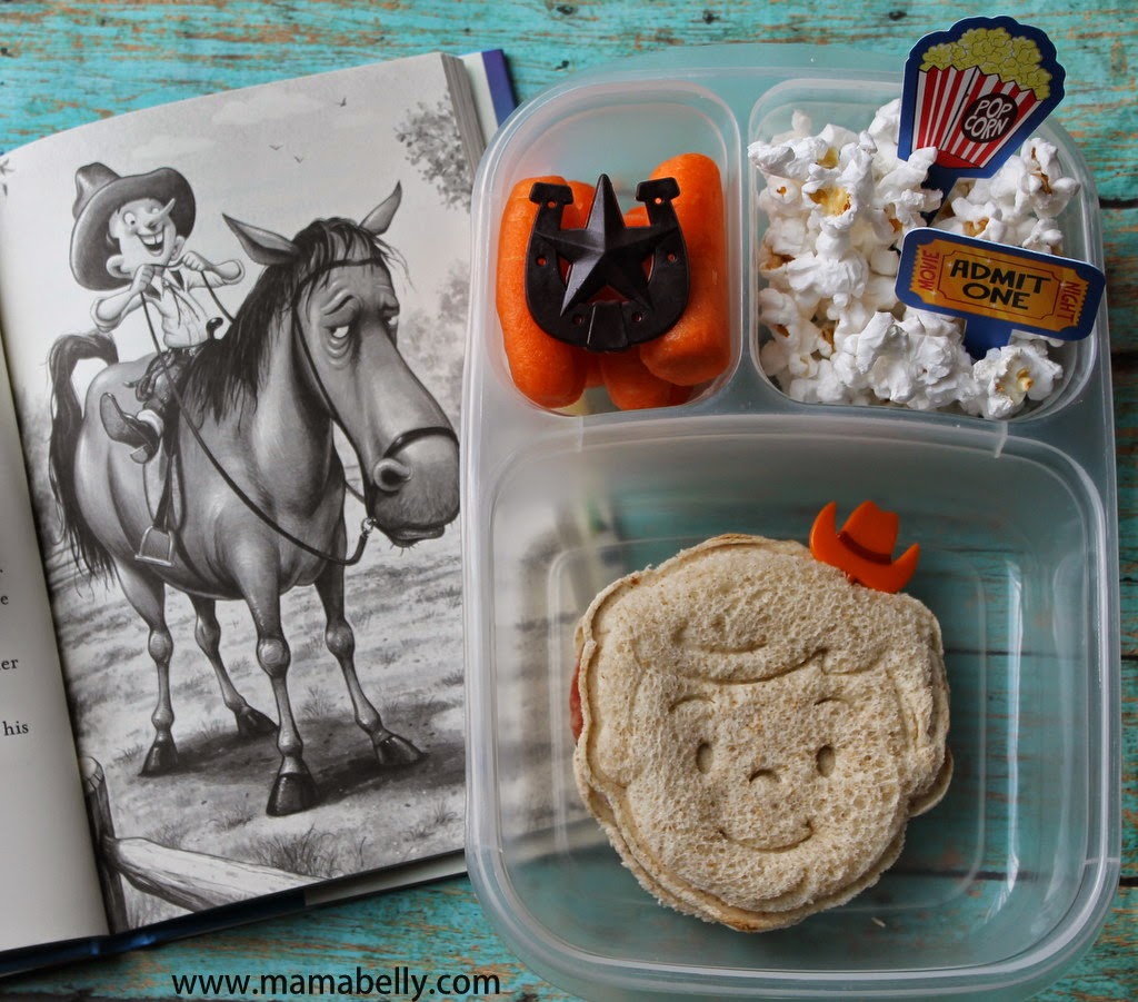 Nina from Mamabelly's Lunches with Love packed a lunch perfect for rescuing the horse of your dreams:carrots for Maybelline, the horsepopcorn from the Bijou Drive-in Theatre concession stand, where Leroy work and a Leroy Ninker Salami Sandwich