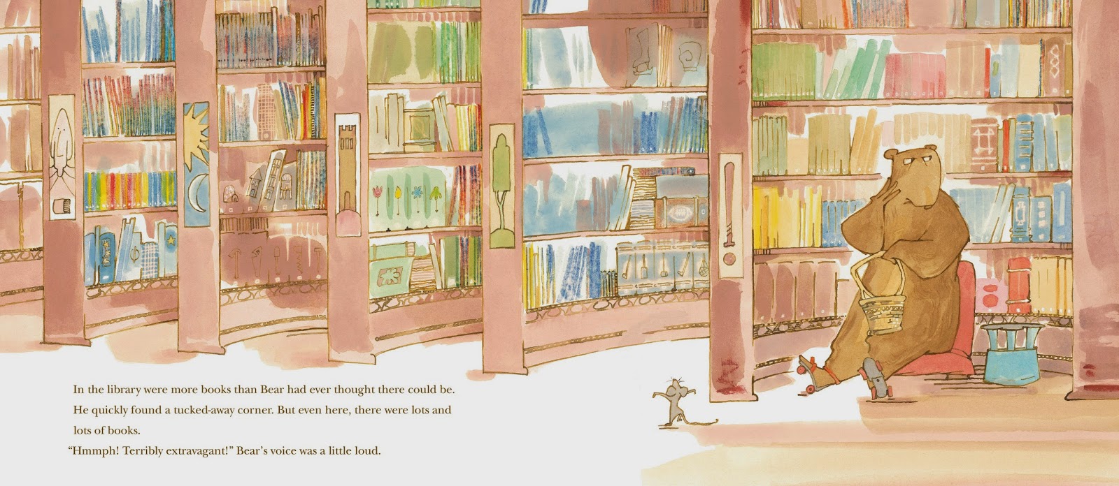 and illustrated by Kady MacDonald Denton, tells the story of Bear's first trip to the library. Bear is quite sure he needs only the seven books he already owns, while his best friend, Mouse, tries to show him all the library has to offer.