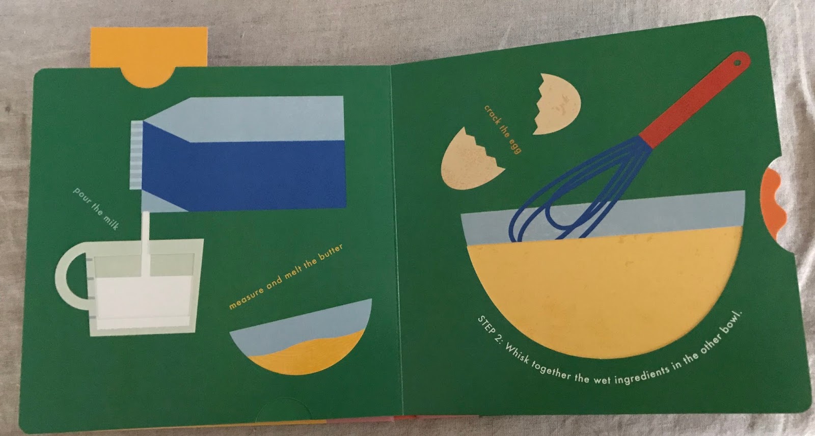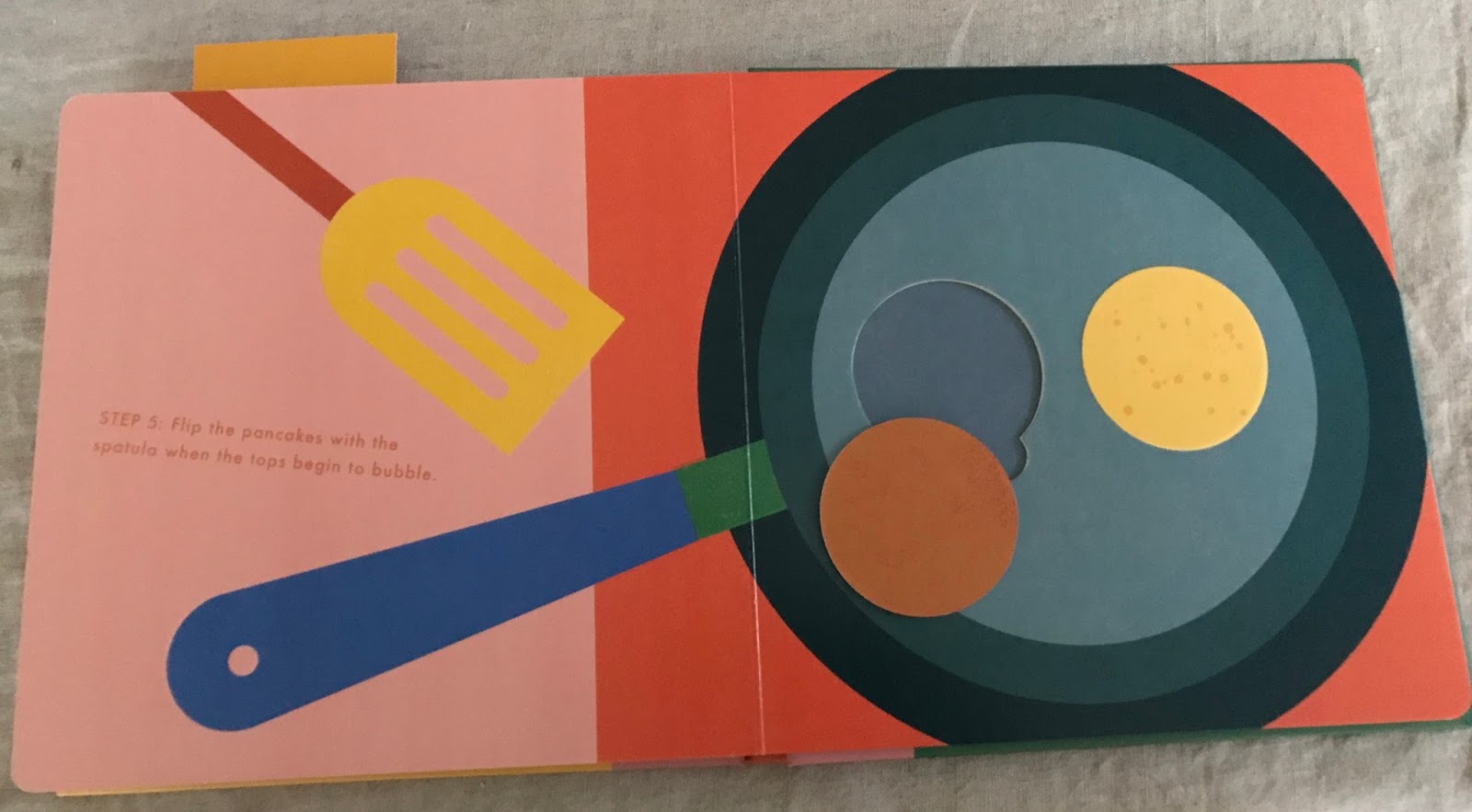 It's an interactive guide to making pancakes, featuring a real recipe, wheels and tabs so you can add the flour and pour the milk, and a pop-out pancake for flipping and serving!