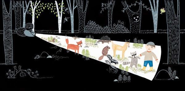 From FLASHLIGHT. Illustration copyright 2014 by Lizi Boyd. Why kids will love it . . . After reading FLASHLIGHT, kids will want to break out their own flashlights to explore the natural world around them. They'll also love the surprise ending--tables are turned when an owl shines the light on the boy, providing the first time we see the boy in color.