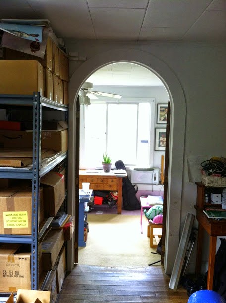 Probably the coolest thing about my studio are these old double doors between the two rooms. A previous owner of our house was the postmaster in town. And when they built the new post office in 1963, he took these old doors out of the old post office and installed them here.They lead to the other room in my studio, which is mostly just boxes of books, flat files filled with artwork . . .