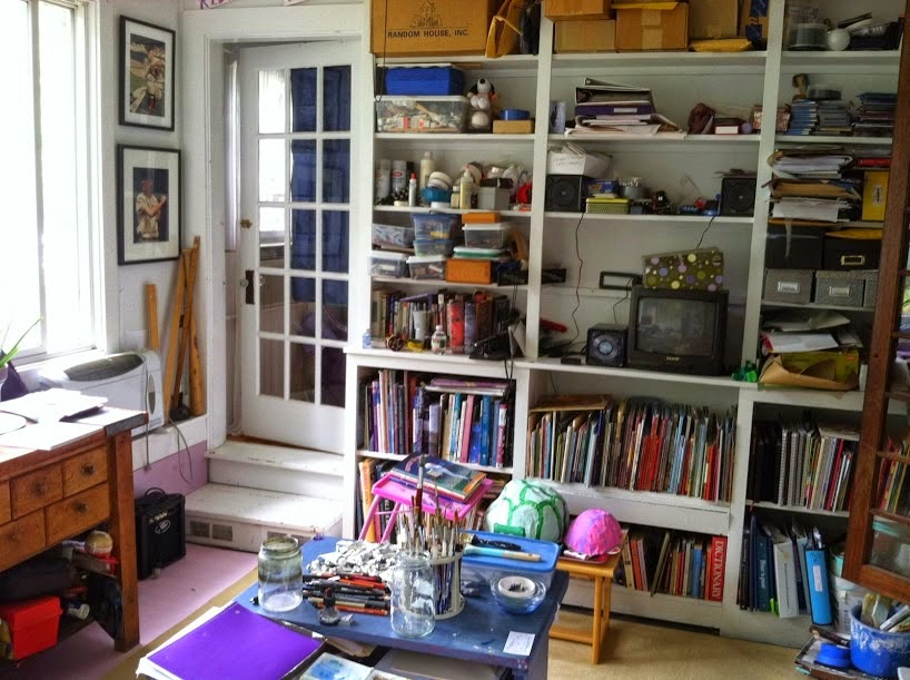 As you already know (since you were just standing in my living room) my studio is right here in my house. I live with my wife and our two daughters in an old house by the ocean in Maine. My studio takes up two rooms. This room is where I do pretty much all of my work—writing, drawing, painting, research. Here you can see my drawing table, bookcase, a bunch of artwork by my kids, some baseballs, a sculpture I did in college, and an old typewriter.