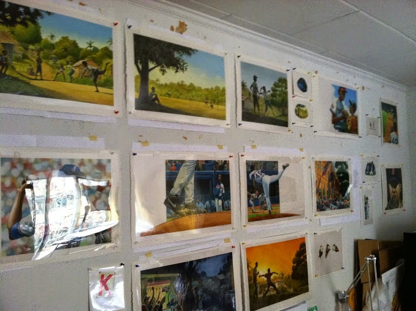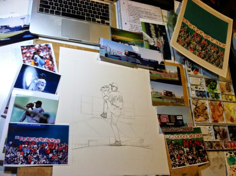 As you can see, sometimes my kids work with me. That's my daughter, who seems to be drawing some kind of sea monster attacking people on a beach (or maybe he's just chatting with them, I can't tell) while I paint a picture of Ramon and Pedro Martinez.