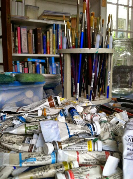 There's an idea! Feel free to take a closer look at the art supplies on the table next to my drawing table. I use mostly watercolor and pencil, and sometimes gouache and ink.