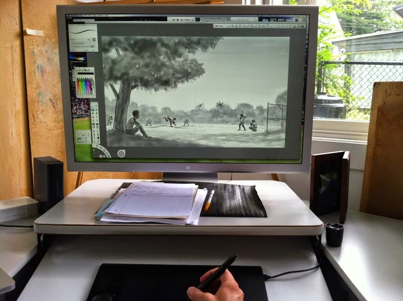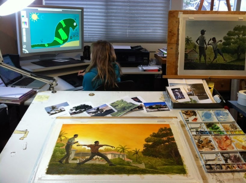 Once I get to the final art, the real paintings that you see in my books, I go back to the old drawing table and use real paint, pencils, brushes, and paper. Here's a picture I took as I was just starting the cover art for Growing Up Pedro, which comes out in February.