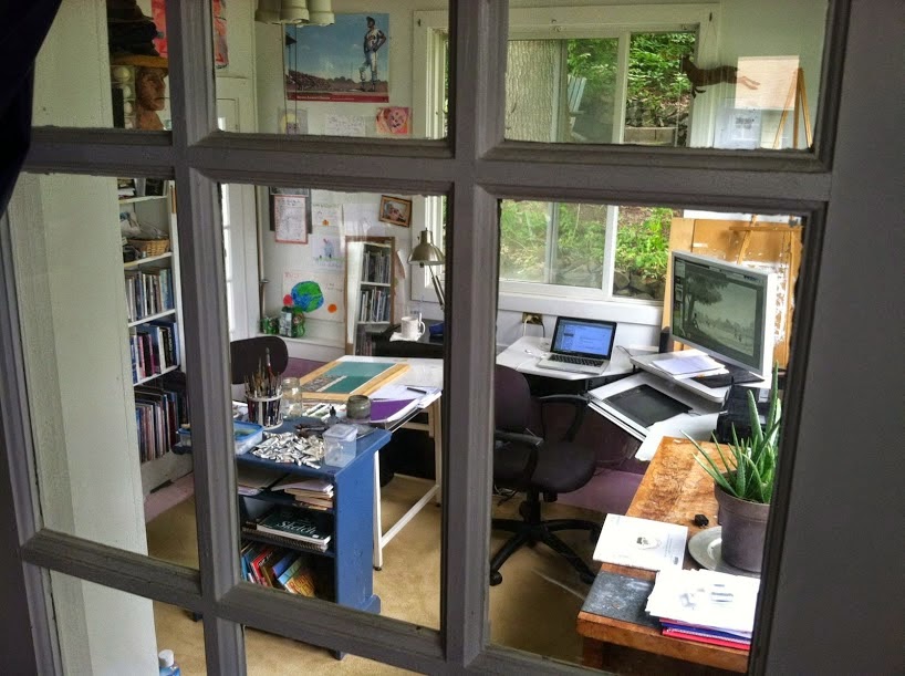 As you already know (since you were just standing in my living room) my studio is right here in my house. I live with my wife and our two daughters in an old house by the ocean in Maine. My studio takes up two rooms. This room is where I do pretty much all of my work—writing, drawing, painting, research. Here you can see my drawing table, book case, a bunch of artwork by my kids, some baseballs, a sculpture I did in college, and an old typewriter.